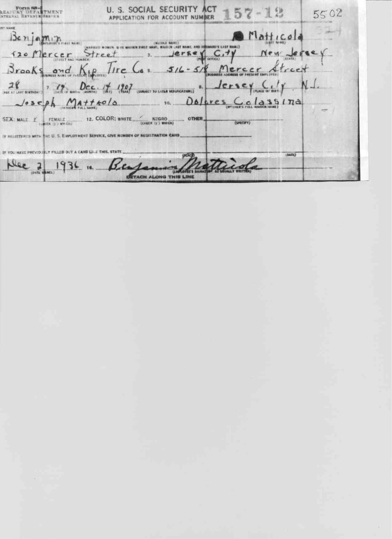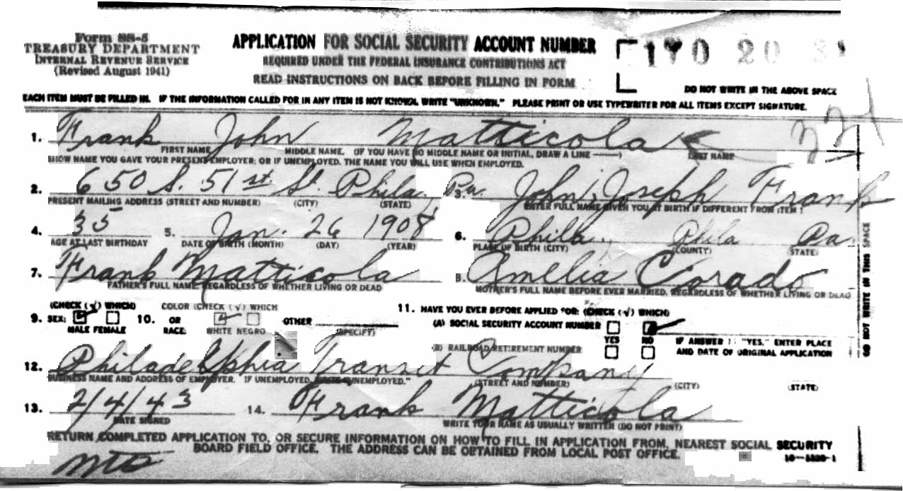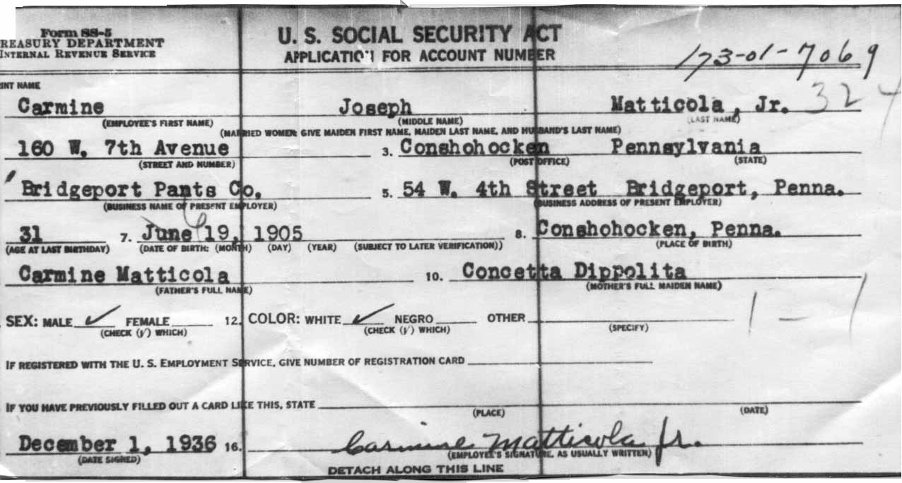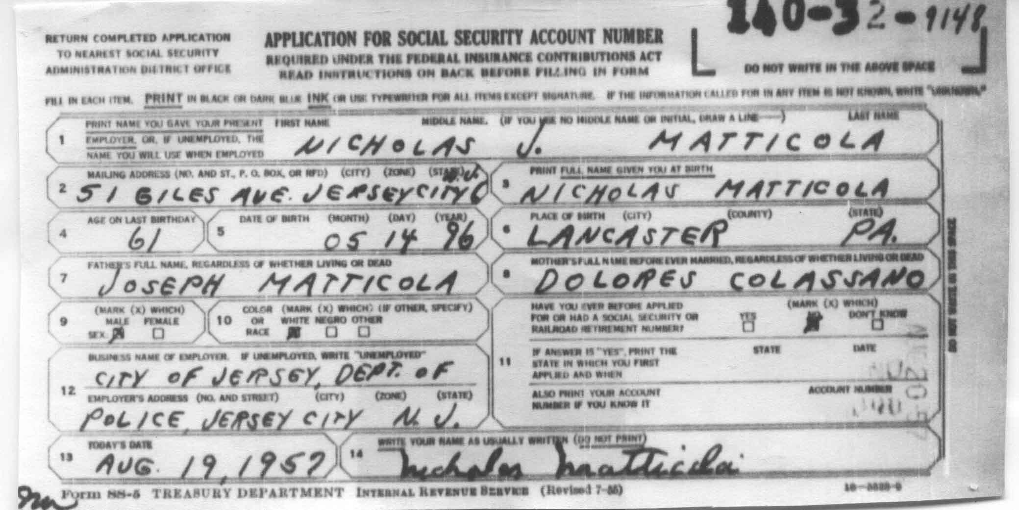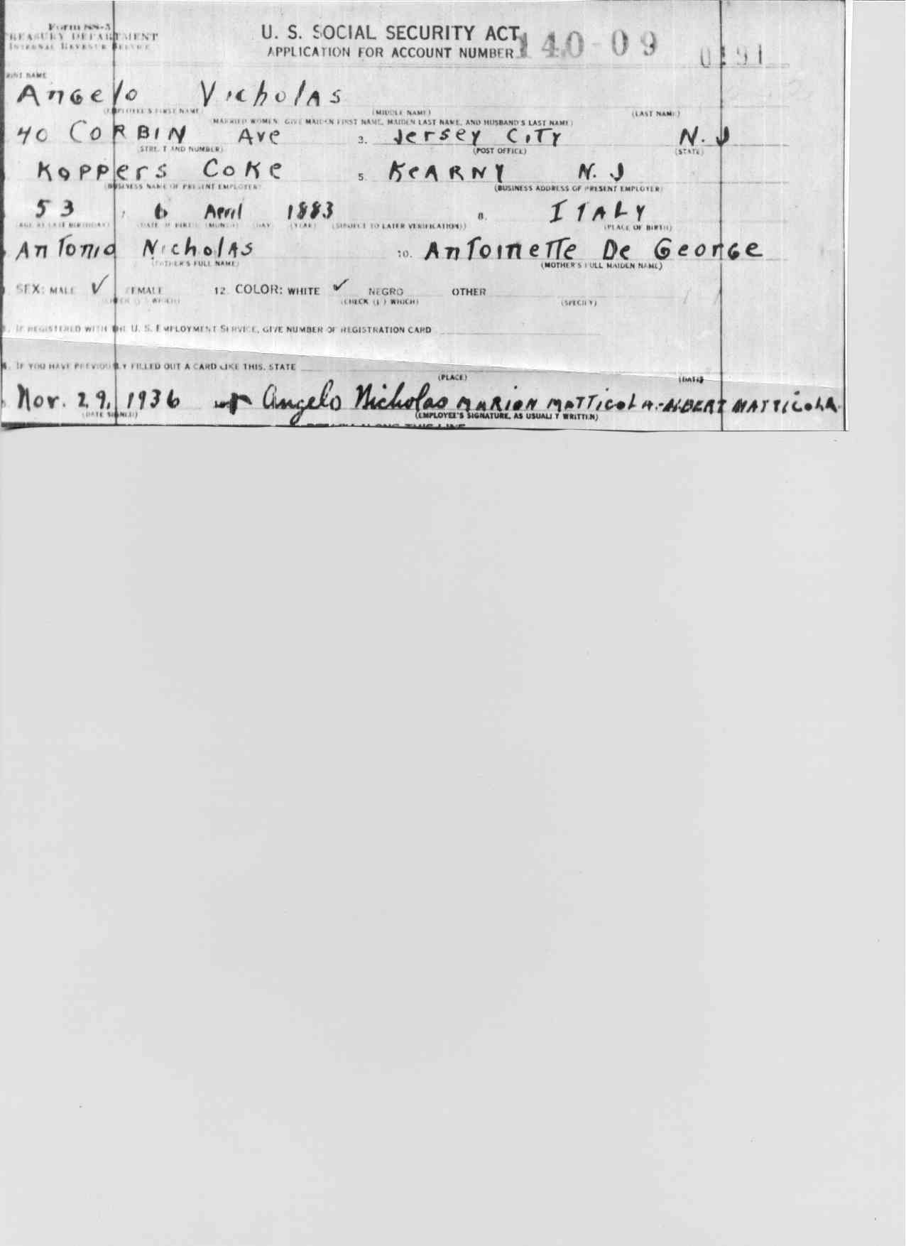 These are the Matticola Family Members found under the Social Security Death Index. As Time and Money Permits I will send for their Social Security records. Which is available to the Public after their death Inactivation of their Socail Security numbers. These records include their ss-5 , which is thier actaul application for A SSN#, This application includes, parents names, address at the time , Employer and Their job information . Watch for these records, I will scan them and make them available.