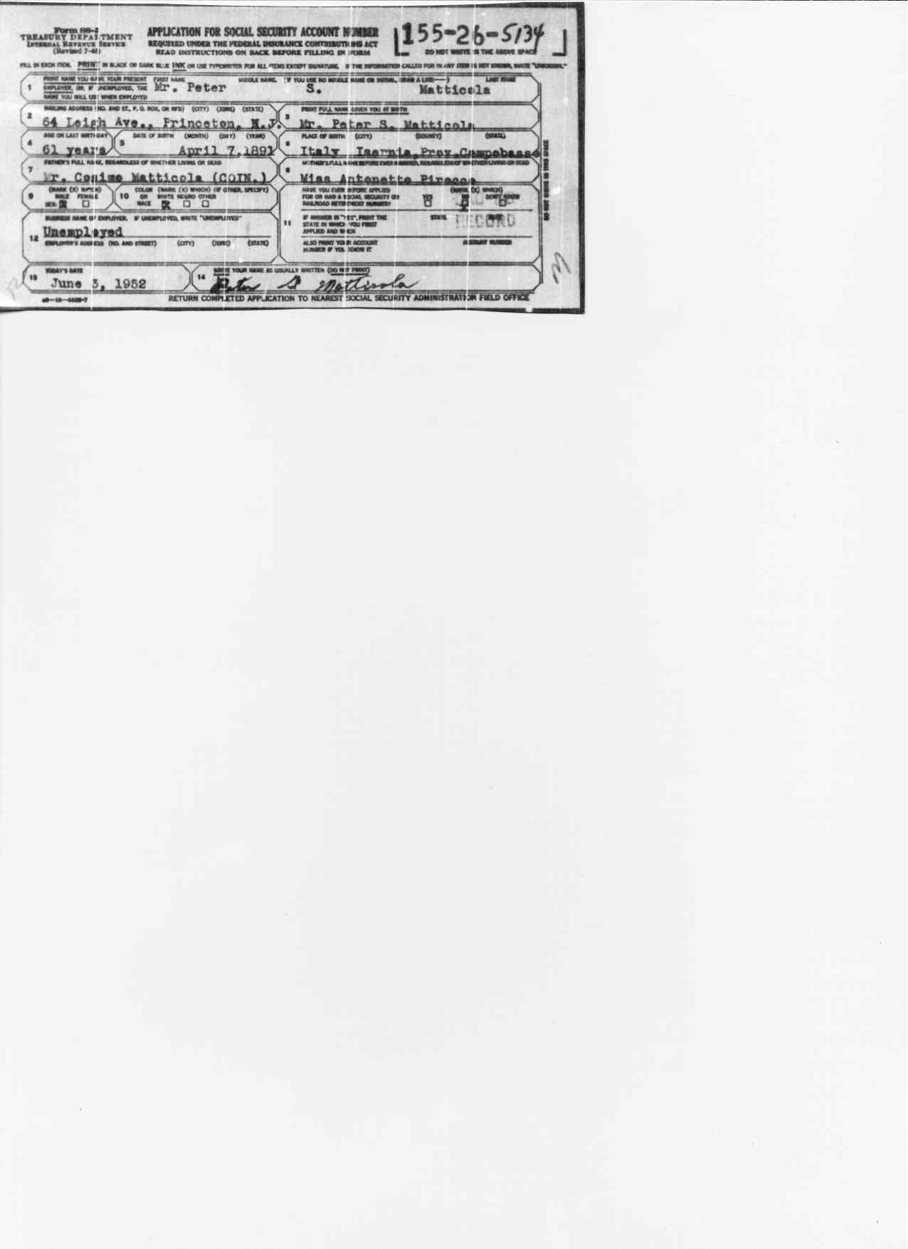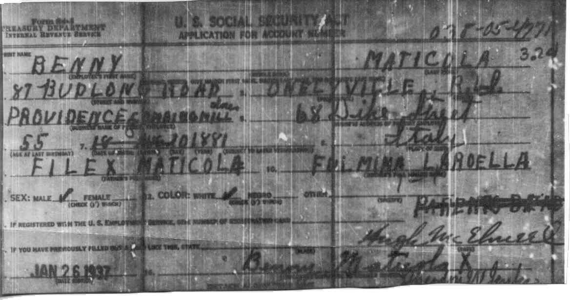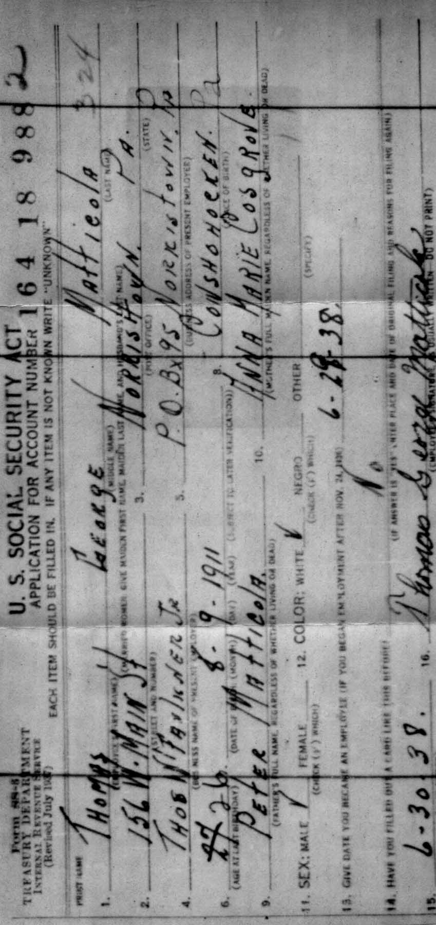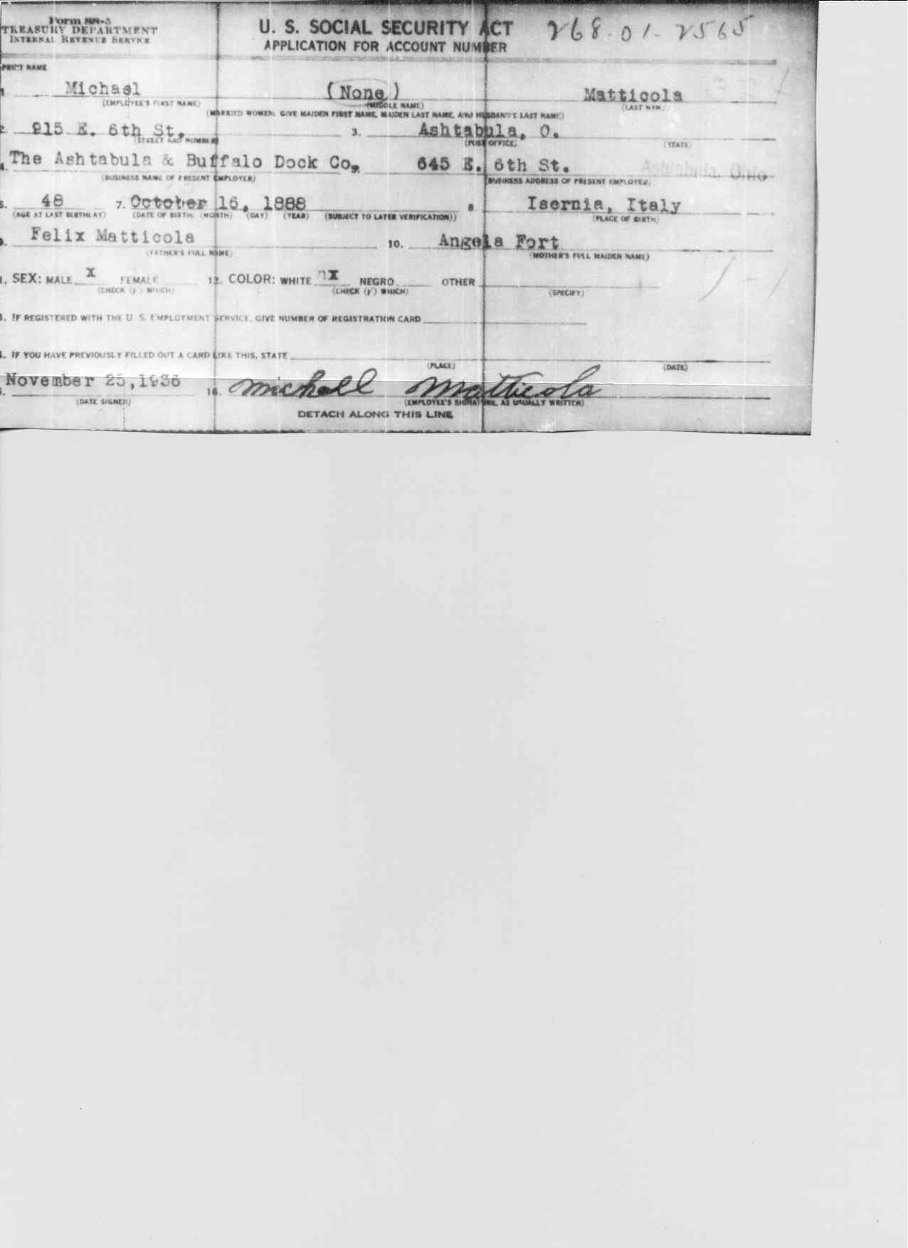 These are the Matticola Family Members found under the Social Security Death Index. As Time and Money Permits I will send for their Social Security records. Which is available to the Public after their death Inactivation of their Socail Security numbers. These records include their ss-5 , which is thier actaul application for A SSN#, This application includes, parents names, address at the time , Employer and Their job information . Watch for these records, I will scan them and make them available.